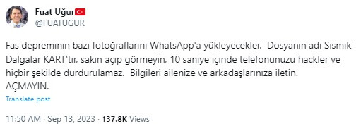 Fuat Uğur: “Fas depreminin bazı fotoğraflarını WhatsApp’a yükleyecekler. Dosyanın adı Sismik Dalgalar KART’tır, sakın açıp görmeyin, 10 saniye içinde telefonunuzu hackler ve hiçbir şekilde durdurulamaz. Bilgileri ailenize ve arkadaşlarınıza iletin. AÇMAYIN.”