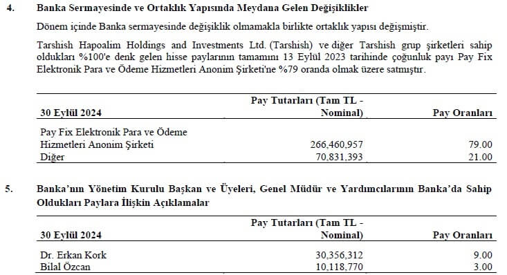 Nitekim Bankacılık Düzenleme ve Denetleme Kurulunun 12.05.2023 tarih ve 10600 sayılı kararıyla; Tarshish Hapoalim Holdings and Investments Ltd.’nin Bankadaki doğrudan %99,9999976 oranındaki payının %0’a düşmesine, Bank Hapoalim B.M.’nin Bankadaki dolaylı %99,9999976 oranındaki payının %0’a düşmesine, Bankanın çoğunluk hisselerinin PayFix Elektronik Para ve Ödeme Hizmetleri A.Ş.’ye devrine izin verilmesine karar verilmiştir. Akabinde, Bankacılık Düzenleme ve Denetleme Kurulunun 15.08.2024 tarih ve 10946 sayılı kararıyla ise PayFix Elektronik Para ve Ödeme Hizmetleri A.Ş.’nin Bankadaki doğrudan %79 oranındaki payının %0’a düşmesine ve çoğunluk hisselerin Capitalturk Holding A.Ş.’ye geçmesine izin verilmesine karar verilmiştir.