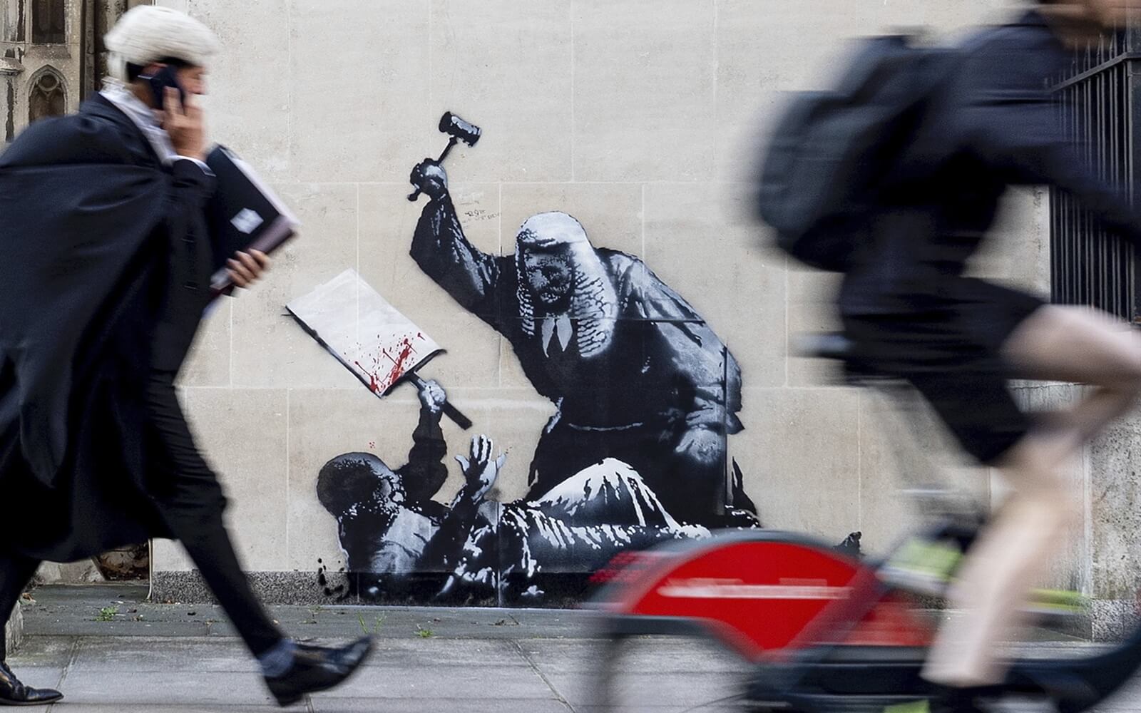 Banksy, Kraliyet Adalet Sarayı duvarında bir yargıcın protestocuya elindeki tokmakla saldırdığı bir sahneyi resmetti.