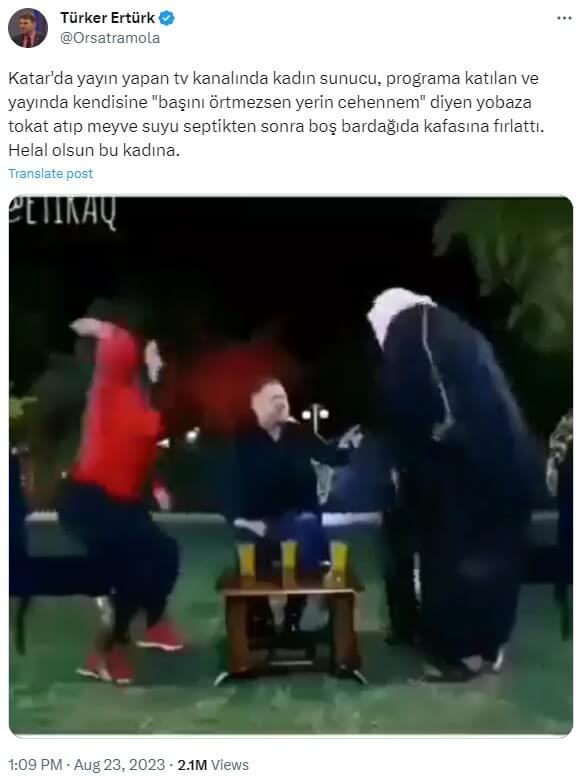 Bircan Yıldırım (@BRCNYLDRM78): “Katar’da yayın yapan tv kanalında kadın sunucuya yayın sorasında programa katılan kişi “başını örtmezsen yerin cehennem” dedi. Sunucu kadın, önce tokat attı, sonra meyve suyunu adama septikten sonra boş bardağıda kafasına fırlattı. Kendini Allah yerine koyup, haddini bilmezsen bildirirler.”