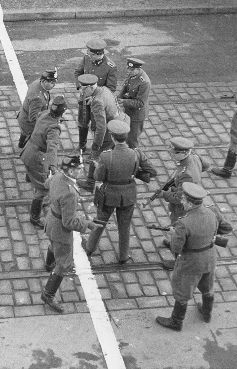 Sol taraf Batı Almanya polisleri, sağ taraf Doğu Almanya birlikleri.