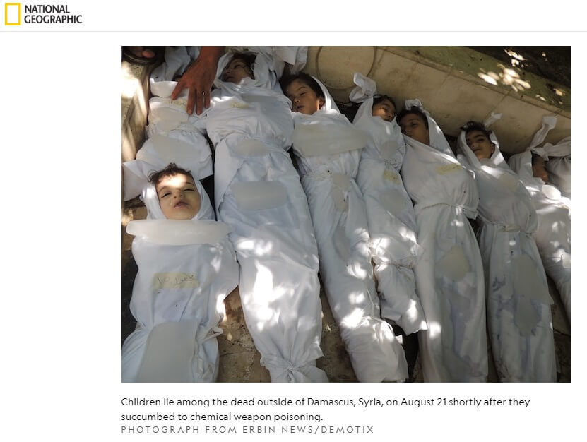 “Suriye, ‘kimyasal silah saldırıları’ 21 Ağustos 2013’te Şam’ın Guta banliyösüne yapılan şüpheli kimyasal silah saldırısının ardından sinir gazı ile öldürülen çocukların cesetleri” (“Syria, ‘chemical weapon attacks’ Corpses of children killed by nerve gas after a suspected chemical weapons attack on the Damascus suburb of Ghouta, in August 21, 2013. Photo: Erbin News/NurPhoto (Photo by NurPhoto/Corbis via Getty Images)”) notuyla bahse konu görsel şöyle paylaşılmıştı: