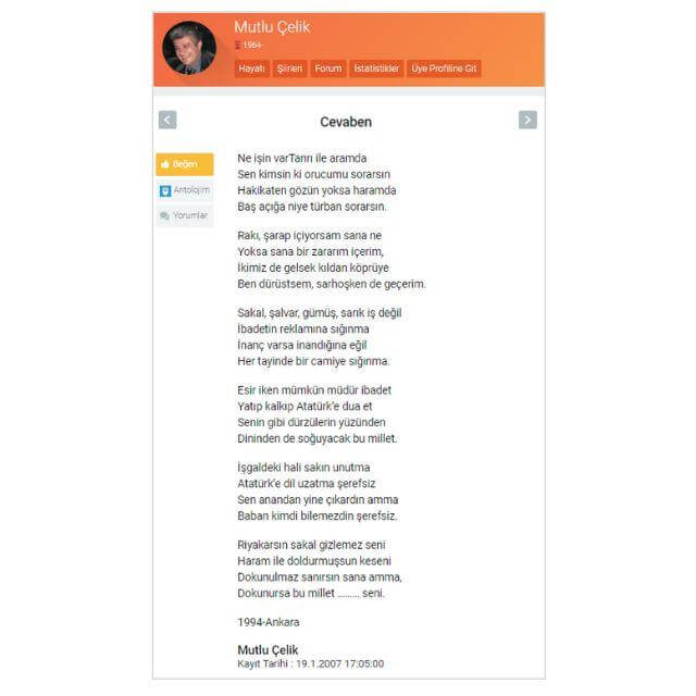 Ne ararsın Tanrı ile aramda Sen kimsin ki orucumu sorarsın? Hakikaten gözün yoksa haramda, Başı açığa niye türban sorarsın! Rakı, şarap içiyorsam sana ne. Yoksa sana bir zararım içerim. İkimiz de gelsek kıldan köprüye Ben dürüstsem sarhoşken de geçerim. Esir iken mümkün müdür ibadet? Yatıp kalkıp Atatürk'e dua et. Senin gibi dürzülerin yüzünden, Dininden de soğuyacak bu millet. İşgaldeki hali sakın unutma, Atatürk'e dil uzatma sebepsiz. Sen anandan yine çıkardın amma, Baban kimdi bilemezdin şerefsiz...