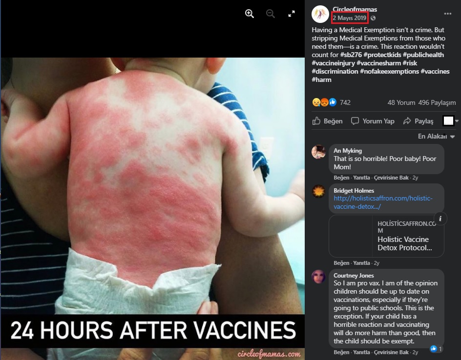 Paylaşılan görselin kaynağı, -sağ altındaki nottan da anlaşılabileceği üzere- ABD’nin California eyaletinde yaşayan anneler odaklı aşı karşıtı motivasyonla faaliyet gösteren 2017 yılında kurulan Circleofmamas.com adlı internet sitesi.