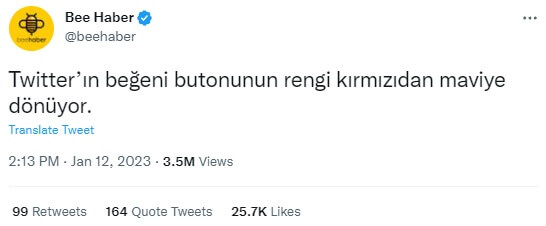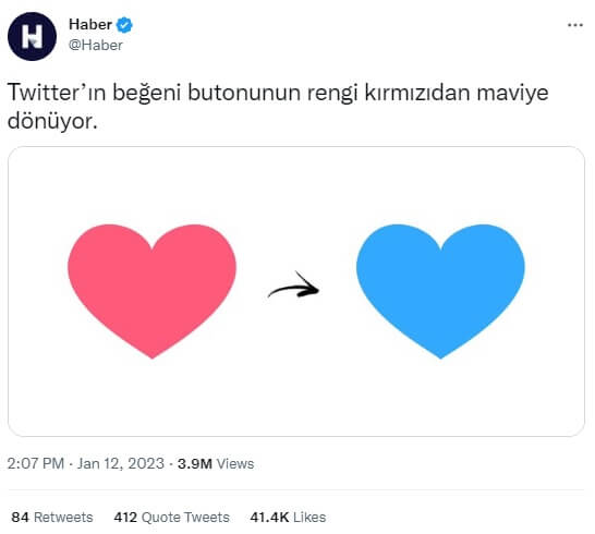 Ancak, 2023 yılı başı itibarıyla Twitter’ın beğeni butonunun rengini kırmızıdan ❤️ maviye dönüştüreceğini duyurduğu iddiası gerçeği yansıtmıyor.