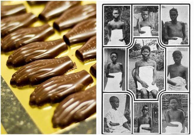 Belçika’nın ünlü kesik el şeklindeki çikolatalarının Belçika Kralı II. Leopold’ün 1908 yılına kadar sömürdüğü Kongo’da kauçuk hasatını eksik yapan kölelerin ellerini ceza olarak kestirmesine dayandığı ileri sürülüyor.
