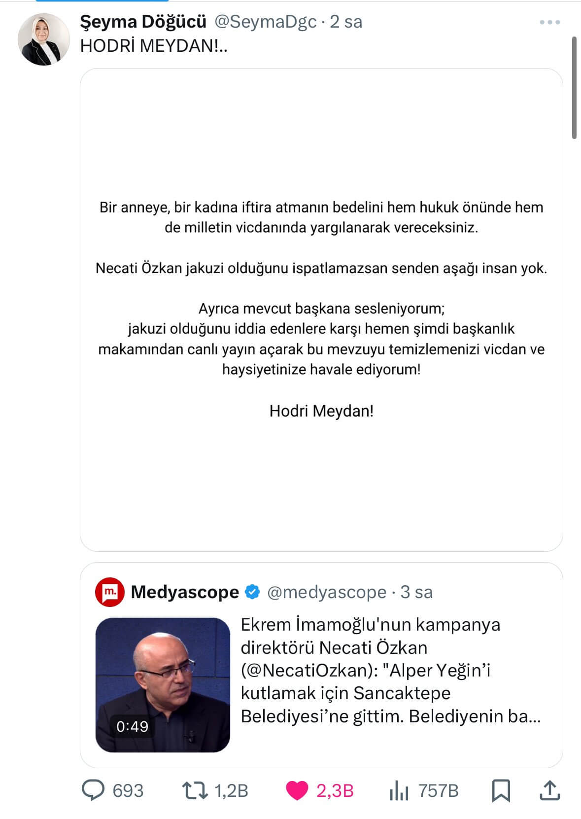 Şeyma Döğücü’nün bu tekzibinin ardından Necati Özkan sosyal medya hesabından yaptığı paylaşımda belediye başkanlık makamında “jakuzi”den kastının “kocaman banyo teşkilatı” olduğunu söyledi.