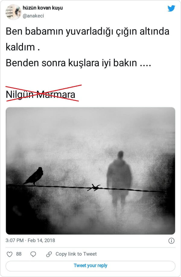 Sosyal medyada Nilgün Marmara (1958-1987) imzasıyla paylaşıldığına şahit olduğumuz “ben babamın yuvarladığı çığın altında kaldım” sözü, şairin “Kan Atlası” adlı şiirinde ayrı olarak ve tırnak içinde yer almış olup, aslında Avusturyalı yazar Ingeborg Bachmann’a aittir ve yazarın Malina adlı romanında geçer.