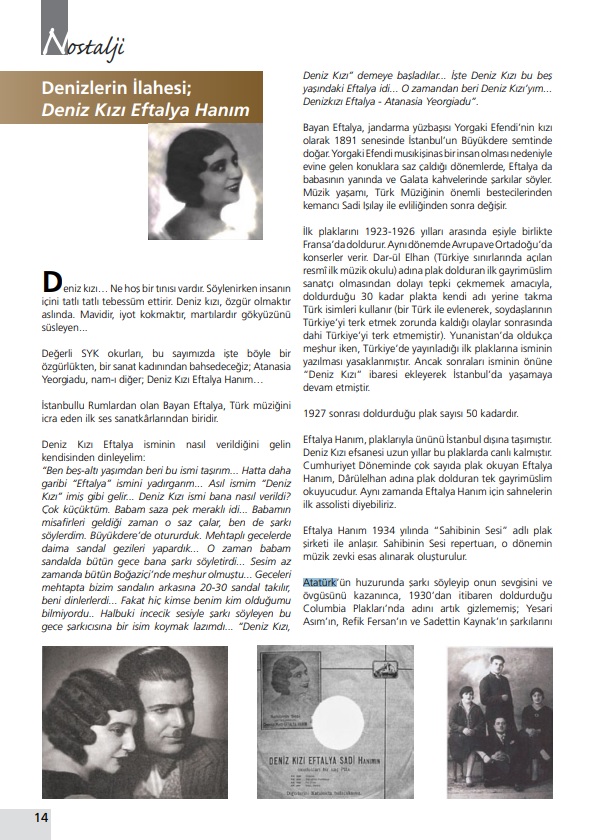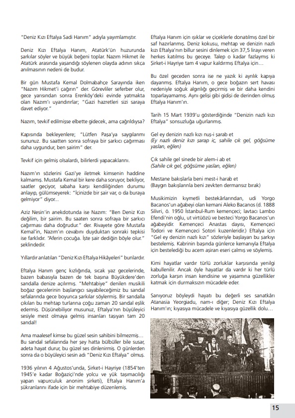 Nâzım Hikmet’in atıf yaptığı isim olan Deniz Kızı Eftalya (Işılay) (Atanasia Yeorgiadu) (1891-1939) adlı (döneminin ünlü) ses sanatçısının Atatürk’ün huzurunda şarkı söylediği ve şarkılarının beğenildiği aktarılmaktadır.