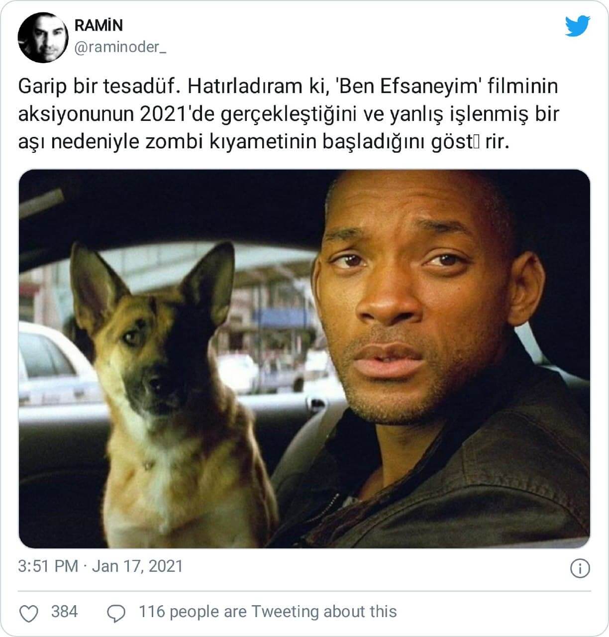 “Garip bir tesadüf. Hatırladıram ki, ‘Ben Efsaneyim’ filminin aksiyonunun 2021’de gerçekleştiğini ve yanlış işlenmiş bir aşı nedeniyle zombi kıyametinin başladığını göstərir.”