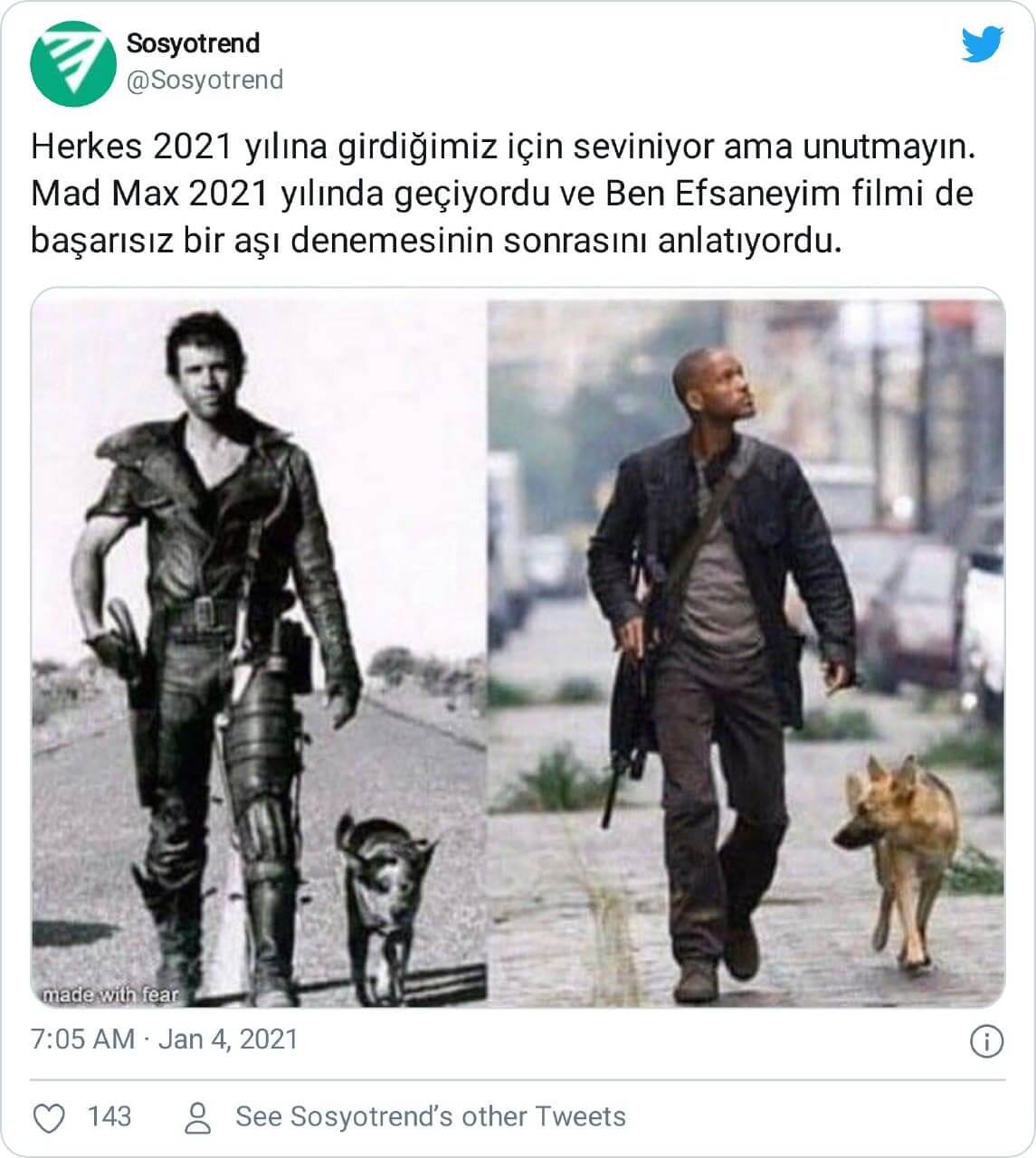 “Herkes 2021 yılına girdiğimiz için seviniyor ama unutmayın. Mad Max 2021 yılında geçiyordu ve Ben Efsaneyim filmi de başarısız bir aşı denemesinin sonrasını anlatıyordu.”