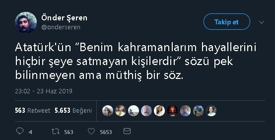 "Hem ne demiş Başkomutan Mustafa Kemal Atatürk: “ Benim kahramanlarım hayallerini hiçbir şeye satmayan kişilerdir.“"