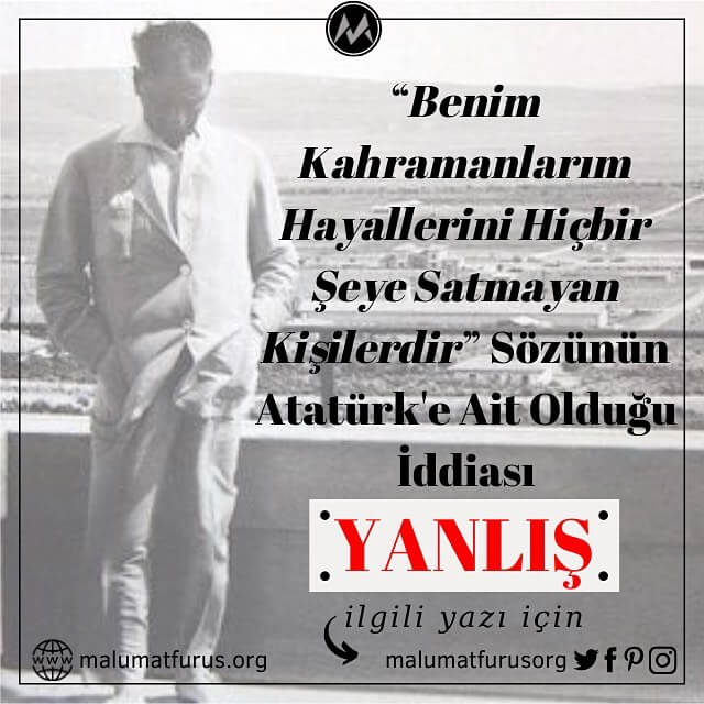 İddia edilenin aksine “benim kahramanlarım hayallerini hiçbir şeye satmayan kişilerdir” özdeyişi Atatürk’e ait değildir. Bahse konu vecize, Atatürk’ün vefatının 73 yıl sonrasında kendisine atfedildiği anlaşılmaktadır. Atatürk’ün söylev ve demeçleri ile tamim ve telgraflarını içeren kitaplar incelendiğinde böyle bir sözün izine rastlanamamaktadır.