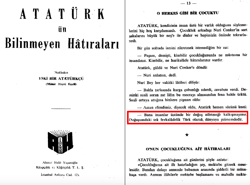 Münir Hayri Egeli, Atatürk ve Nuri Conker ile ismini vermek istemediğini belirttiği bir kişi arasında geçen konuşmada “Bana, insanlar üstünde bir doğuş atfetmeye kalkışmayınız. Doğuşumdaki tek fevkaladelik, Türk olarak dünyaya gelmemdir.” cümlesinin kullanıldığını aktarmıştı.