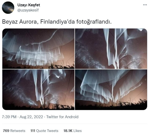 Uzay hakkında sıklıkla yanlış bilgi paylaşan bazı profillerde bu görseller “Beyaz Aurora, Finlandiya’da fotoğraflandı” notuyla aktarılmıştı.