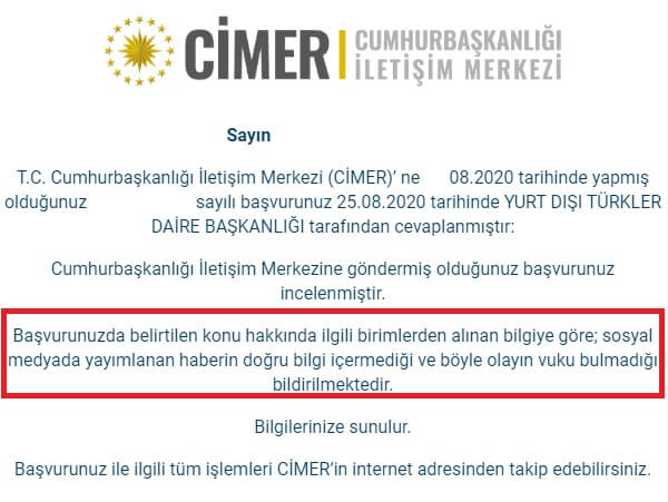 Cumhurbaşkanlığı İletişim Merkezi (CİMER) üzerinden Sağlık Bakanlığı Otizm, Zihinsel Özel Gereksinimler ve Nadir Hastalıklar Dairesi Başkanlığı tarafından sunulan yanıt ise şu şekilde idi: