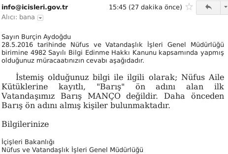Türkiye’de Barış adını alan ilk kişinin Barış Manço olduğu iddiasının doğru olmadığını yapılan bilgi edinme başvurusuna Nüfus ve Vatandaşlık İşleri Genel Müdürlüğü tarafından verilen yanıt suretiyle netleştirilmişti.