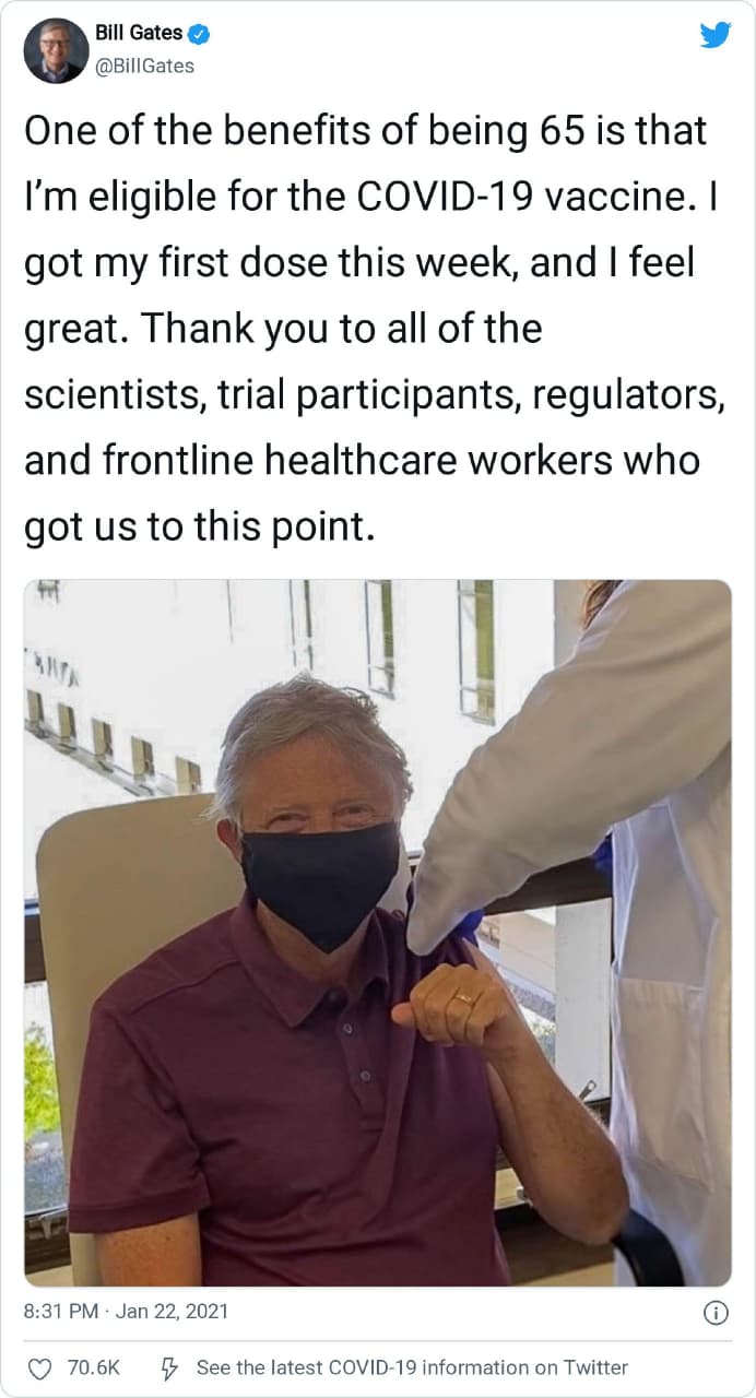 22 Ocak 2021 tarihli tweetinde 65 yaşının üzerinde olmanın avantajlarından birinin aşıya erişim olduğunu vurgulayan ve bu aşamaya gelinmesinde katkısı bulunanlara teşekkür eden Bill Gates, ilk doz aşısını olduğunu belirtmiş ve aşı olduğu andan bir fotoğrafı paylaşmıştı.