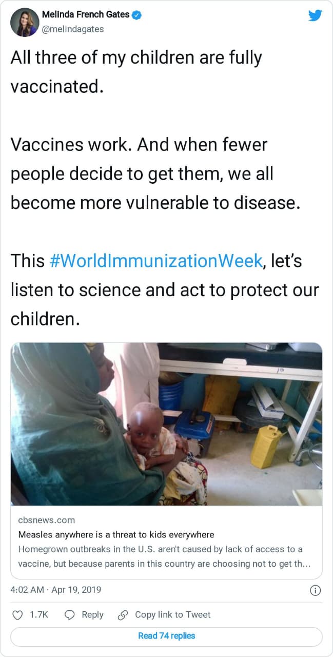 Melinda Gates, koronavirüs salgını henüz ortada yokken yükselen aşı karşıtı söylem ve ailesi hakkında yöneltilen iddialar karşısında 2019 yılı Nisan ayında yaptığı sosyal medya paylaşımında kendisinin ve 3 çocuğunun gerekli aşılarını olduklarını ifade etmişti.