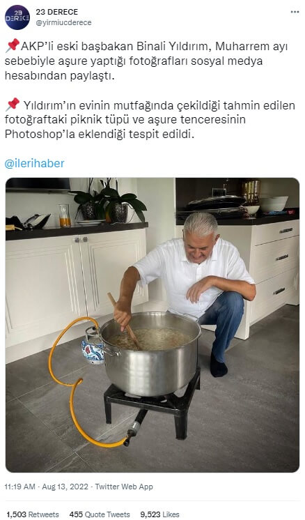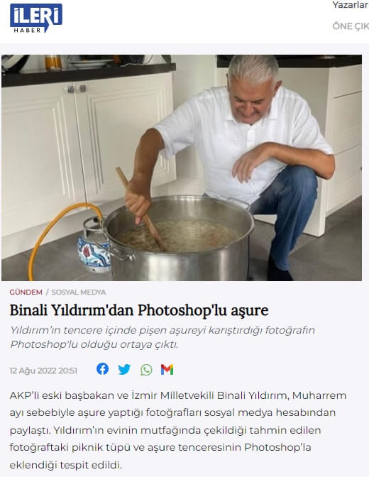 AKP’li eski başbakan ve İzmir Milletvekili Binali Yıldırım, Muharrem ayı sebebiyle aşure yaptığı fotoğrafları sosyal medya hesabından paylaştı. Yıldırım’ın evinin mutfağında çekildiği tahmin edilen fotoğraftaki piknik tüpü ve aşure tenceresinin Photoshop’la eklendiği tespit edildi.
