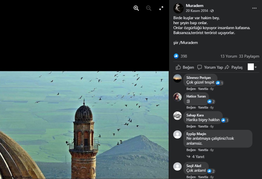 İLAVE: işbu yazının yayımlanmasının akabinde tarafımızla iletişime geçen Muradem mahlaslı şair, söz konusu dizelerin kendisine ait olduğunu, 20 Kasım 2014 tarihinde şiiri Facebook’ta paylaştığını, Facebook’taki Ahmed Arif adına açılan hayran sayfasının şiiri isimsiz paylaşmasının ardından bu karışıklığın oluştuğunu beyan etti (Bu aktarım yukarıda belirtilen şiirin sanal alemde ilk zuhur ettiği tarihle ilgili değerlendirmeyle uyuşuyor. Bahse konu paylaşım öncesinde şiirin izine sanal alemde rastlanamadığı anlaşılıyor).