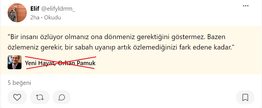 Sosyal medyada sıkça paylaşılmaya başlanan “Bir insanı özlüyor olmanız ona dönmeniz gerektiğini göstermez. Bazen özlemeniz gerekir. Bir sabah uyanıp artık özlemediğinizi fark edene kadar.” sözünün Orhan Pamuk’un Yeni Hayat romanında geçtiği iddiasını ele alacağız.