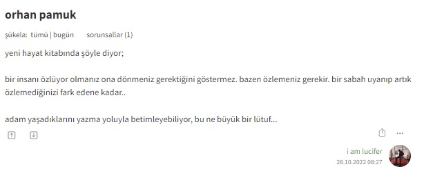 “Orhan Pamuk’un Yeni Hayat kitabında dediği gibi : “Bir insanı özlüyor olmanız, ona dönmeniz gerektiğini göstermez. Bazen özlemeniz gerekir. Bir sabah uyanıp artık özlemediğinizi fark edene kadar.”