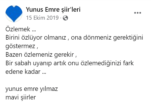 “Mavi Şiirler / Yunus Emre Yılmaz” imzasıyla paylaşılan sözün kendisine ait olup olmadığını öğrenmek amacıyla Yılmaz’a e-postayla ulaştık ancak henüz bir yanıt alamadık (İLAVE: Yılmaz’dan “Altına adımı yazmam başka şekillerde algılanmış olabilirSözün veya yazının sahibi ben değilim öyle bir iddiamda yoktur” yanıtını aldık).