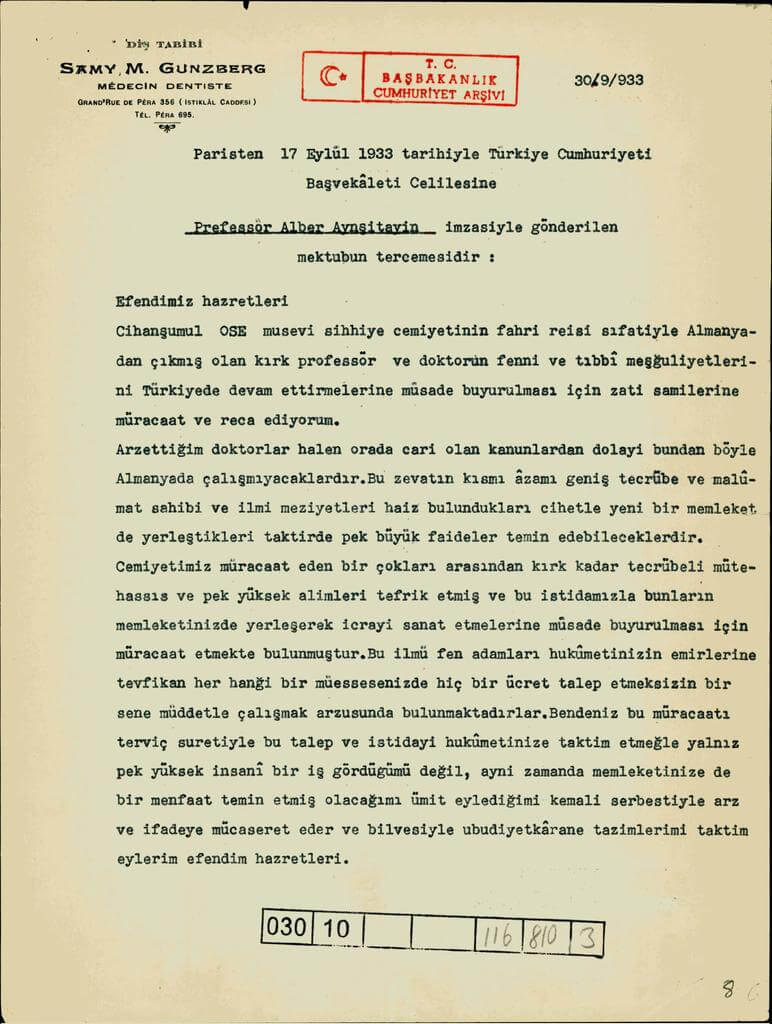 İncelemeyi, Albert Einstein’ın Yahudi Nüfusu Koruma Grupları Birliği (OSE) Başkanı unvanıyla Türkiye Cumhuriyeti (Bakanlar Kurulu Başkanına) Başbakanına hitaben Almanya’daki Yahudi profesörler adına yazdığı, “Almanya’dan 40 Yahudi profesör ve doktorun bilimsel ve tıbbi çalışmalarına Türkiye’de devam etmelerine müsaade edilmesinin” talep edildiği, “sadık hizmetkarınız olmaktan şeref duyuyorum” ifadeleriyle sona eren 17 Eylül 1933 tarihli iltica mektubunun orijinali ve resmî çevirisini alıntılayarak sonlandırmış olalım…