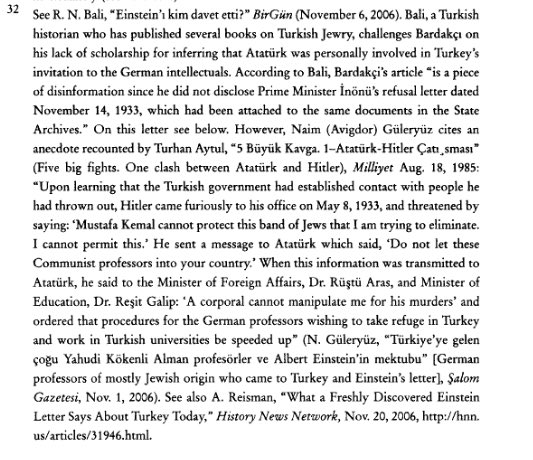 Hitler’in “Benim ortadan kaldırmak istediğim bu Yahudi alayını Mustafa Kemal koruyamaz” mesajına Atatürk’ün “Bir onbaşı beni cinayetlerine alet edemez” yanıtını verdiği iddiasının kaynağı olarak Arnold Reisman’ın “Nazizm’den Yahudi Mülteciler, Albert Einstein ve Türkiye’de Yüksek Öğretimin Modernleşmesi (1933–1945)” (“Jewish Refugees from Nazism, Albert Einstein, and the Modernization of Higher Education in Turkey (1933–1945)” (2007. Aleph. No. 7. Sf: 253–81) başlıklı makalesi sunulmuş.