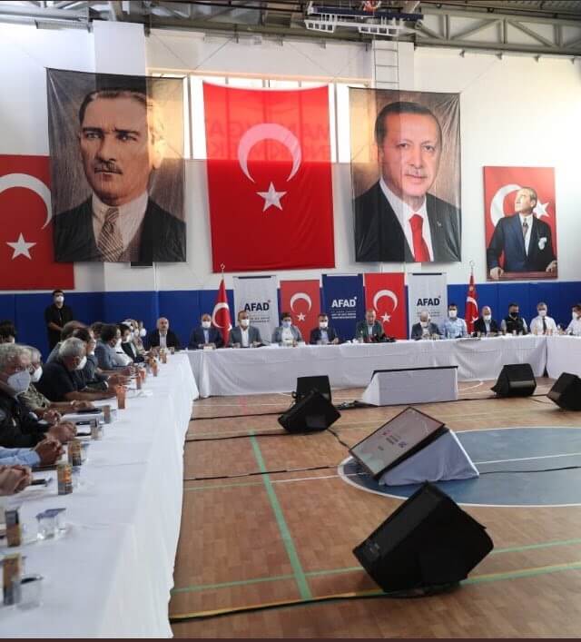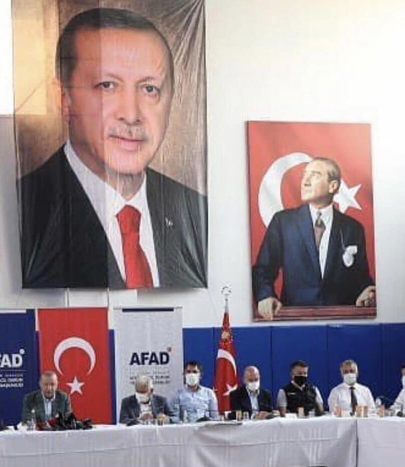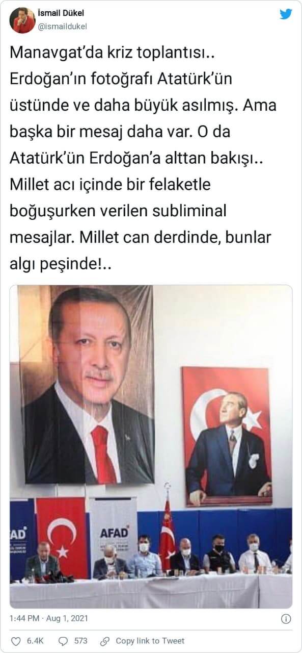 İsmail Bukel de “Manavgat’da kriz toplantısı.. Erdoğan’ın fotoğrafı Atatürk’ün üstünde ve daha büyük asılmış. Ama başka bir mesaj daha var. O da Atatürk’ün Erdoğan’a alttan bakışı.. Millet acı içinde bir felaketle boğuşurken verilen subliminal mesajlar. Millet can derdinde, bunlar algı peşinde!..” yorumunda bulunmuştu.