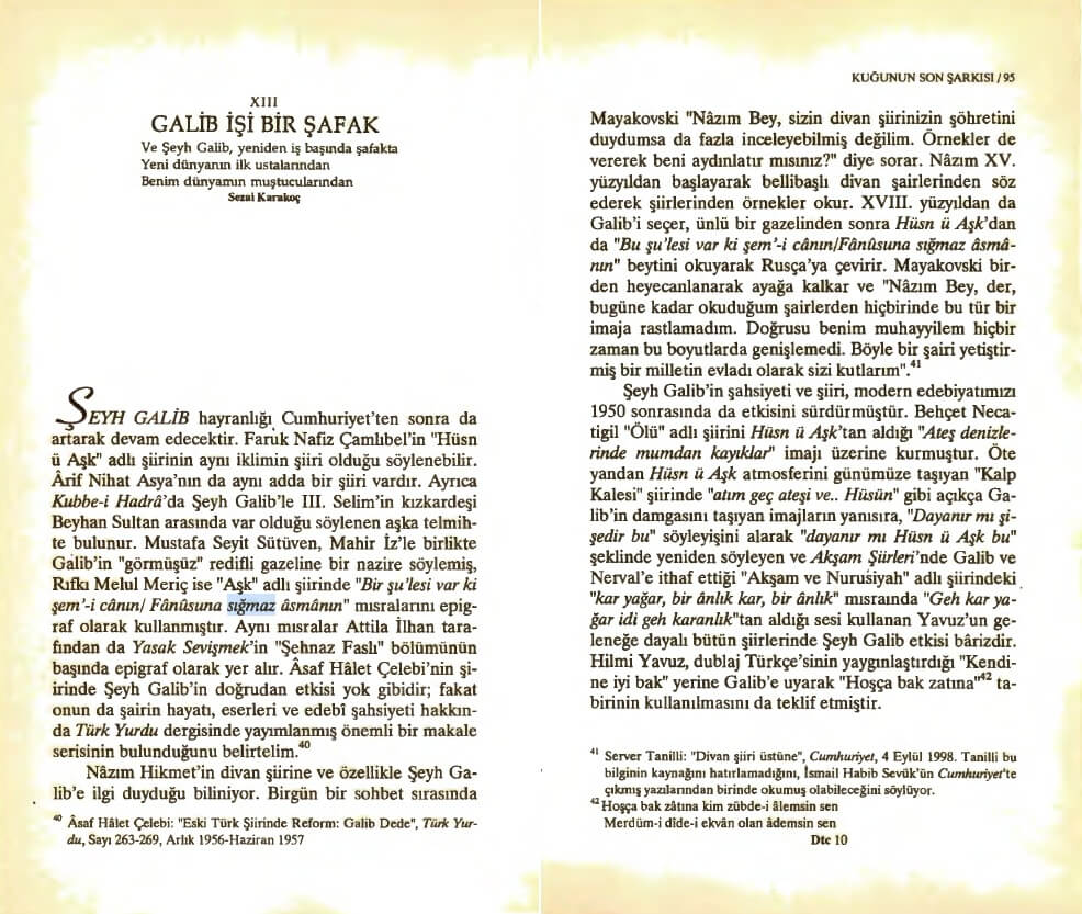 Nâzım Hikmet’in divan şiirine ve özellikle Şeyh Galib’e ilgi duyduğu biliniyor. Birgün bir sohbet sırasında Mayakovski “Nâzım Bey, sizin divan şiirinizin şöhretini duydumsa da fazla inceleyebilmiş değilim. Örnekler de vererek beni aydınlatır mısınız?” diye sorar. Nâzım XV. yüzyıldan başlayarak bellibaşlı divan şairlerinden söz ederek şiirlerinden örnekler okur. XVIII. yüzyıldan da Galib’i seçer, ünlü bir gazelinden sonra Hüsn ü Aşk’dan da “Bu şu’lesi var ki şem’-i cânın/Fânûsuna sığmaz âsmânin” beytini okuyarak Rusça’ya çevirir. Mayakovski bir- den heyecanlanarak ayağa kalkar ve “Nâzım Bey, der, bugüne kadar okuduğum şairlerden hiçbirinde bu tür bir imaja rastlamadım. Doğrusu benim muhayyilem hiçbir zaman bu boyutlarda genişlemedi. Böyle bir şairi yetiştirmiş bir milletin evladı olarak sizi kutlarım”.”