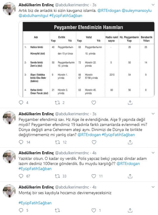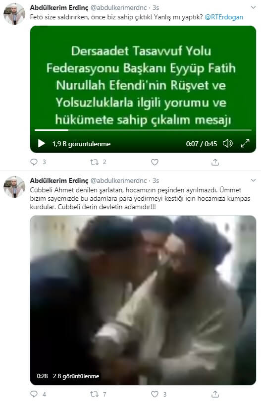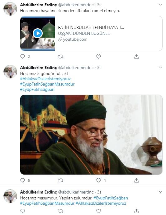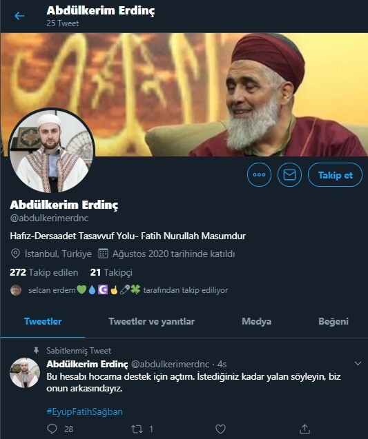 Kendisini “Uşşaki tarikatının şeyhi Fatih Nurullah” olarak tanıtan Eyüp Fatih Şağban’ın 12 yaşındaki kız çocuğunu istismardan tutuklanmasının ardından sosyal medyada ters trolleme yapan operasyonel hesaplar türemeye başlamıştı. Bunlardan biri Abdülkerim Erdinç adlı “abdulkerimerdnc” uzantılı Twitter profiliydi.
