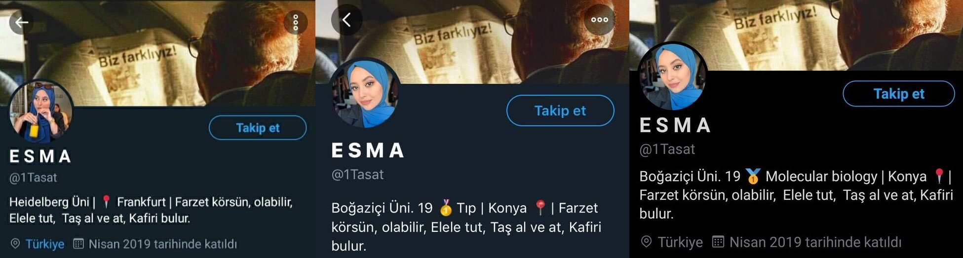 Esma adlı 1tasat uzantılı Twitter trollünün profil bilgilerinin sürekli değiştiği görülüyor.