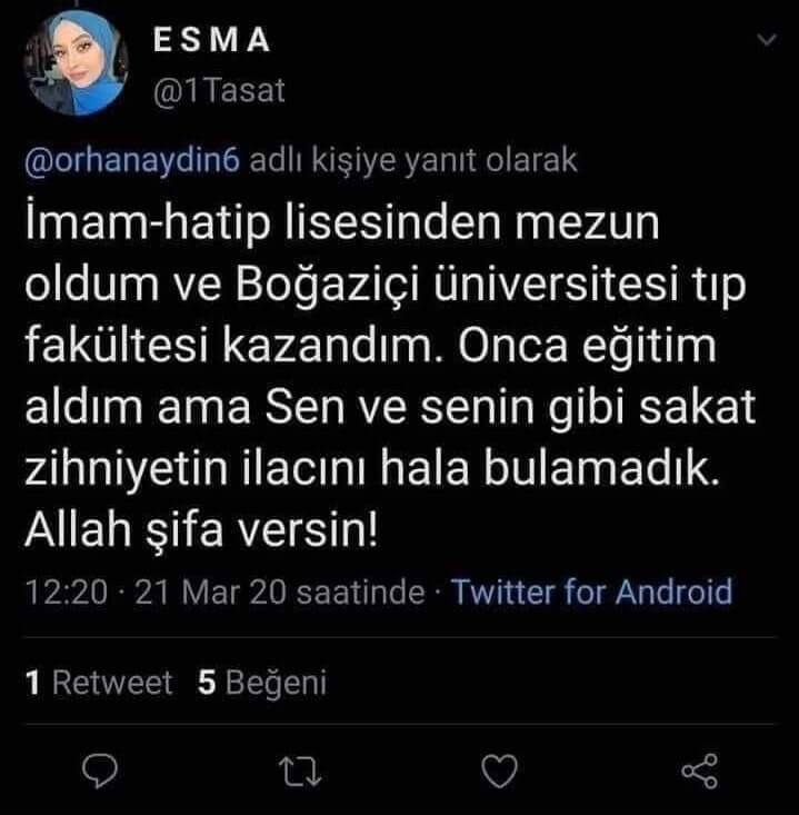 “İmam-hatip lisesinden mezun oldum ve Boğaziçi üniversitesi tıp fakültesi kazandım. Onca eğitim aldım ama Sen ve senin gibi sakat zihniyetin ilacını hala bulamadık. Allah şifa versin!”