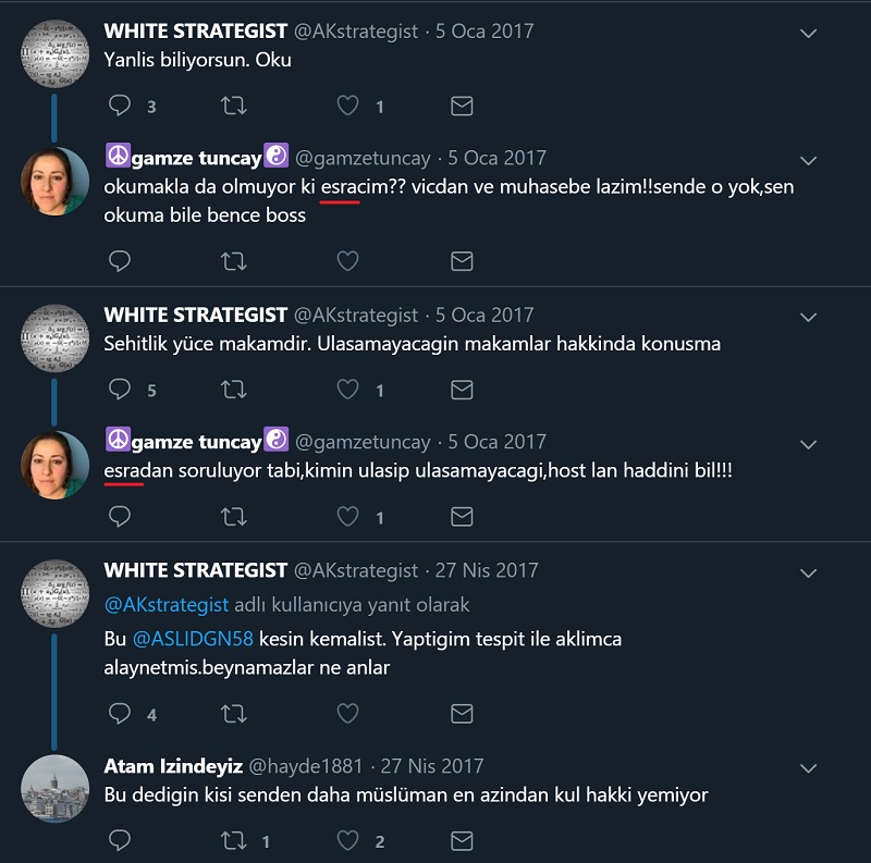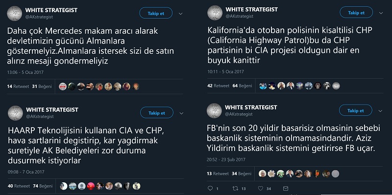 White Strategist adlı “AKstrategist” uzantılı Twitter profilinin 2017 yılı Eylül ayından bu yana paylaşım yapmadığı görülmektedir. AK Strateji adlı “yeniakstrateji” uzantılı profil ise hâlâ aktif.