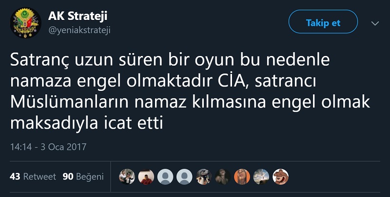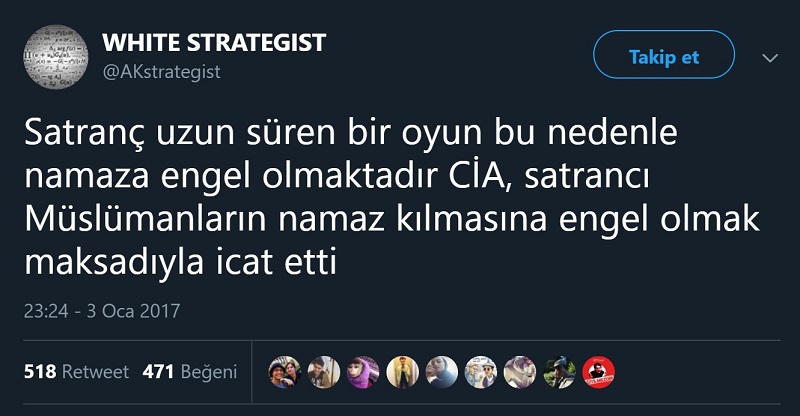 Satrancı CIA’nın Müslümanları namazdan alıkoymak için bulduğu iddiasının atıldığı tek hesap bu değil. Aynı tarihte atıldığı bir diğer hesabın da adının Ak Strateji olduğu görülüyor. Paylaşımları içerik, üslup ve zamanlama açılarından incelendiğinde iki profilin de aynı troll tarafından yürütüldüğü sonucuna ulaşılabilir.