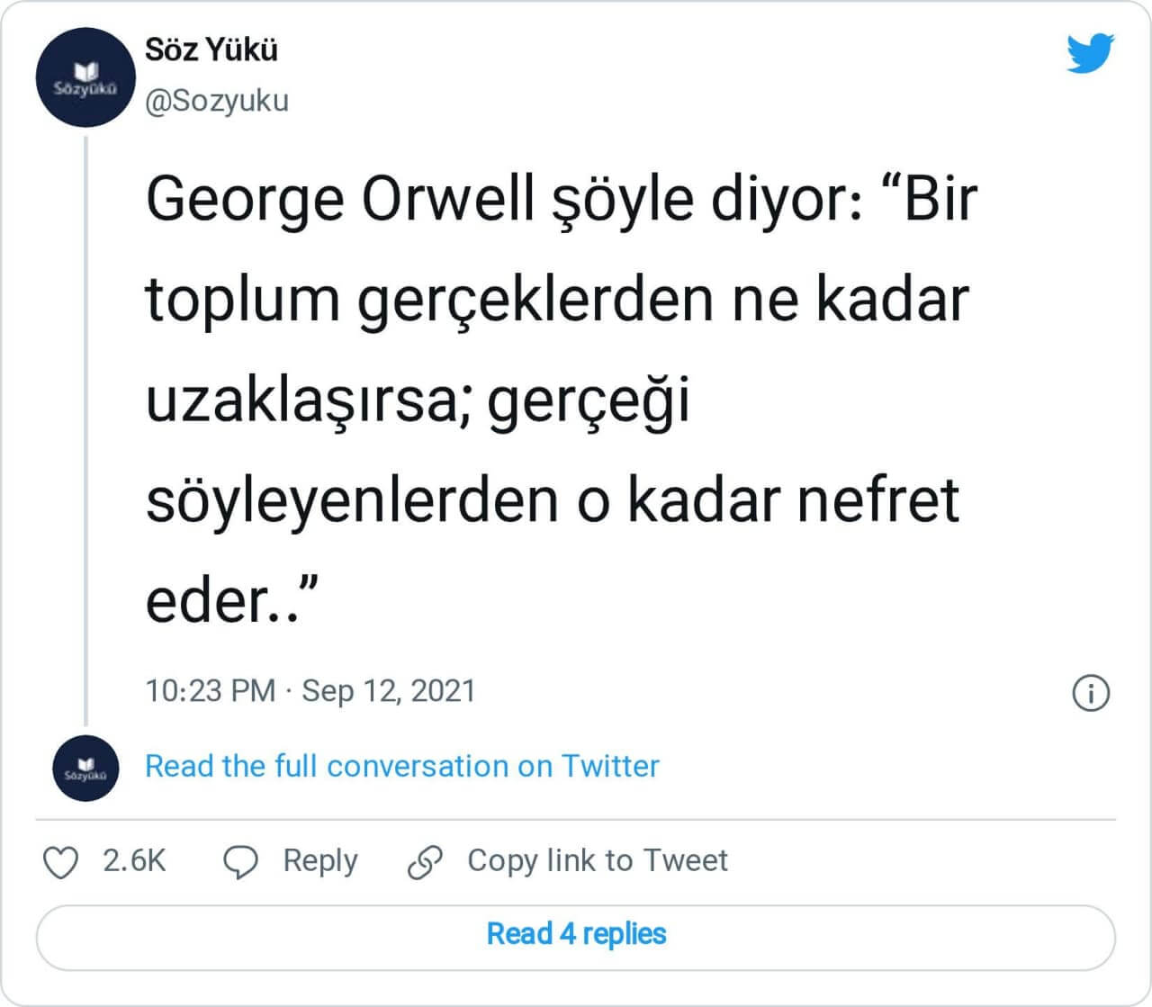 “Bir toplum gerçeklerden ne kadar uzaklaşırsa, gerçekleri söyleyenlerden de o kadar nefret eder.” sözü sanılanın aksine George Orwell’e değil yazar Selwyn Duke’e ait.