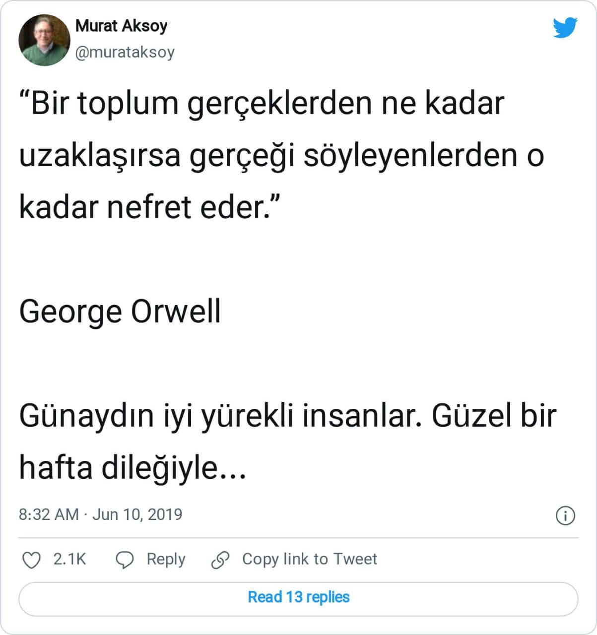 “Hayvan Çiftliği” ve “1984” adlı 2 ünlü eseri ile tanınan 20. yüzyıl İngiliz edebiyatının önde gelen kalemleri arasında yer alan gazeteci ve yazar George Orwell’e (1903 – 1950) ait sanılarak paylaşılan “Bir toplum gerçeklerden ne kadar uzaklaşırsa; gerçeği söyleyenlerden o kadar nefret eder” (“The further a society drifts from the truth, the more it will hate those who speak it“) sözünü ele alacağız.