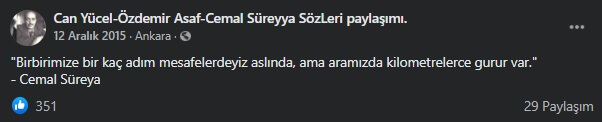 Kaynak konusunda daha dikkatli davranması beklenen bu ve benzeri profillerin ne yazık ki gereken özeni göstermediği açık. Öyle ki paylaşımların çoğu, bu hesabı yürüten kullanıcıların bugüne dek Cemal Süreya’yı “kendi” şiirlerinden okumadığını düşündürecek denli şairin üslubundan -en iyimser tabirle- uzak. Diğer bir deyişle, bu hesapların paylaşımları ile şairin gerçek şiirleri arasındaki fark o kadar fazla ki sözü, şairin imzasıyla paylaşan kullanıcılar “gerçek” Cemal Süreya’yı daha evvel hiç okumamış ya da okumuş olsalar bile şairin kendine özgü biçemini saptayacak ölçüde önem atfetmemişlerdir, diye tahmin ediyoruz.