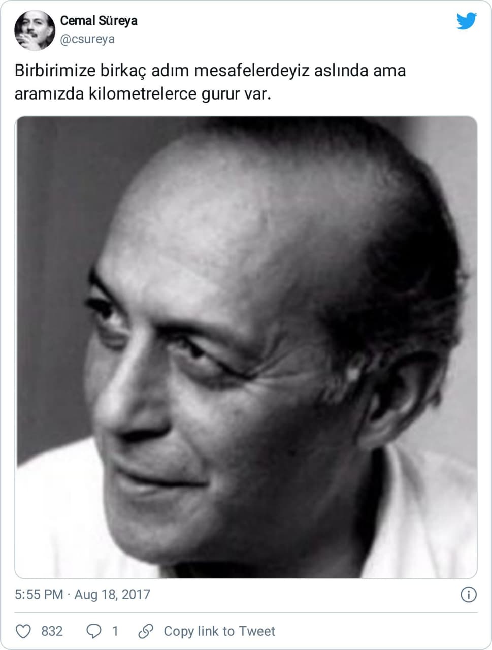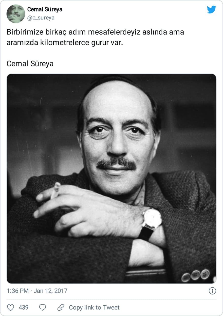 Kendilerine ait olmadığı halde (ekseriyetle) popüler şairlere atfedilen sözleri/ şiirleri incelemeye devam ediyoruz. Bugün, İkinci Yeni’nin önde gelen şairlerinden Cemal Süreya’ya (1931 – 1990) ait olduğu iddiasıyla paylaşılan “Birbirimize birkaç adım mesafelerdeyiz aslında ama aramızda kilometrelerce gurur var.” sözünü konu edeceğiz.