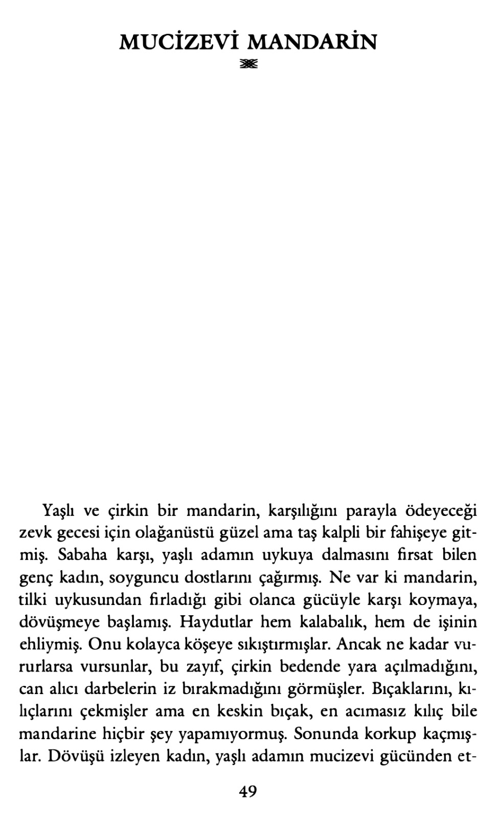 Radikal’de köşe yazıyordu biliyorsunuz. Alçaklık etmek istemiyorum ama onlardan pek etkilendiğimi söyleyemeyeceğim. Ama kadın aynı zamanda kitap yazarı. Bak iş edebiyata gelince, herşey değişiyor. Müthiş öyküleri var. Son okuduğum beş yıl önce yazdığı bir şey: Mucizevi Mandarin. İçinde bir bölüm var ki, yüreğimden beni fena yakaladı. Kitabı elimden bıraktım. Sinematografik bir canlandırma yaptım. Görüntüler resmen gözümün önünden bir bir, kare kare geçti ve çarpıldım. Eski Çin efsanelerinden alınma bu öyküyü ilk sevişmelerinden sonra kadın kahraman, erkeğe anlatıyor. Sayfa 42. Önce yazının arasına girip, kendi dilime filan çevireyim dedim, sonra vazgeçtim. Kadın oturmuş yazmış, mükemmel bir şekilde zaten anlatmış. O zaman ben de size aktarmakla yetiniyorum…