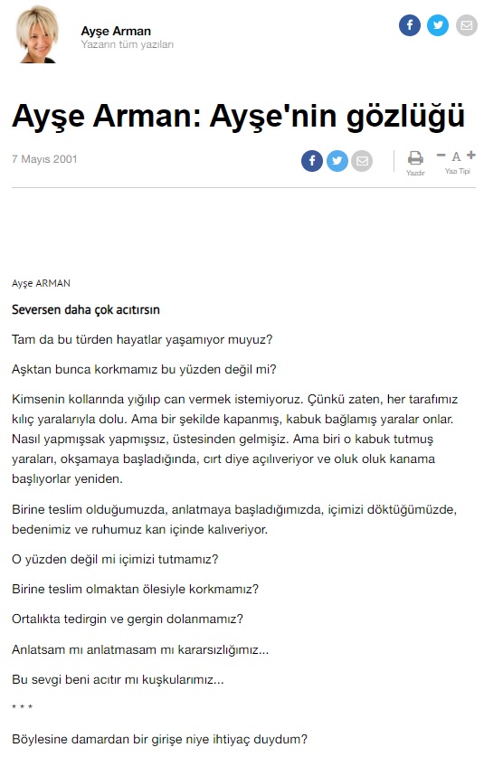 Ayşe Arman’ın Hürriyet’teki “Ayşe Arman: Ayşe’nin gözlüğü” adlı köşesinde “Seversen daha çok acıtırsın” başlıklı yazısında 7 Mayıs 2001 tarihli yazısından ilgili bölüm şöyleydi: