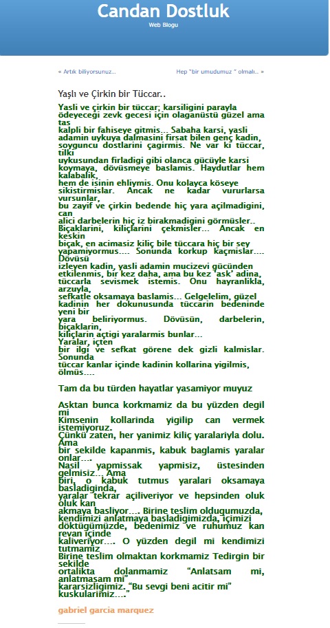 “aslı erdoğan’ın mucize mandarin kitabından bahseden ayşe arman’ın yazdığı bir metin bu. sonrasında bir blog yazarı öykünün adını değiştiriyor, bloğuna yazıyor, altına da ayşe arman’ın köşe yazısındaki bu metni ekliyor ve marquez adıyla paylaşıyor. hikaye bu.”