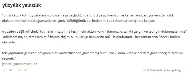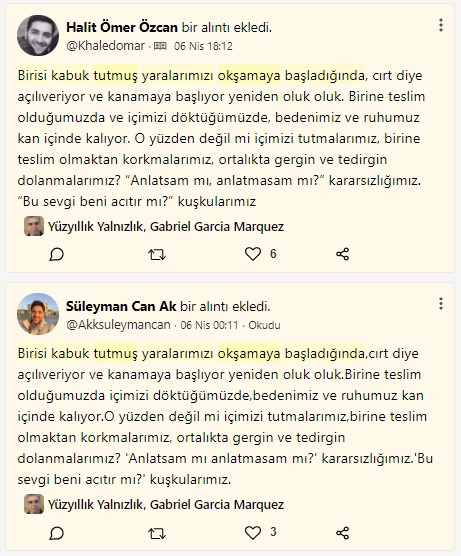 Utku Turhan: “Çok teşekkür ediyorum ilginize. O kadar rahatladım ki, yazı sahibi kusura bakmasın da Marquez’e pek yakıştıramadığım bir metindi. Yüzyıllık Yalnızlık’ta olmadığına emindim ama acaba dedim Kolera Günlerinde Aşk’ta falan olabilir mi? Tekrar tekrar teşekkürler.”