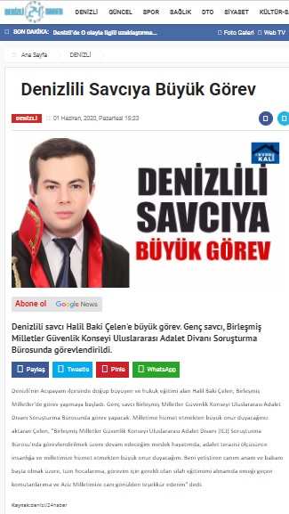 “Denizlili savcı Halil Baki Çelen’e büyük görev. Genç savcı, Birleşmiş Milletler Güvenlik Konseyi Uluslararası Adalet Divanı Soruşturma Bürosunda görevlendirildi.