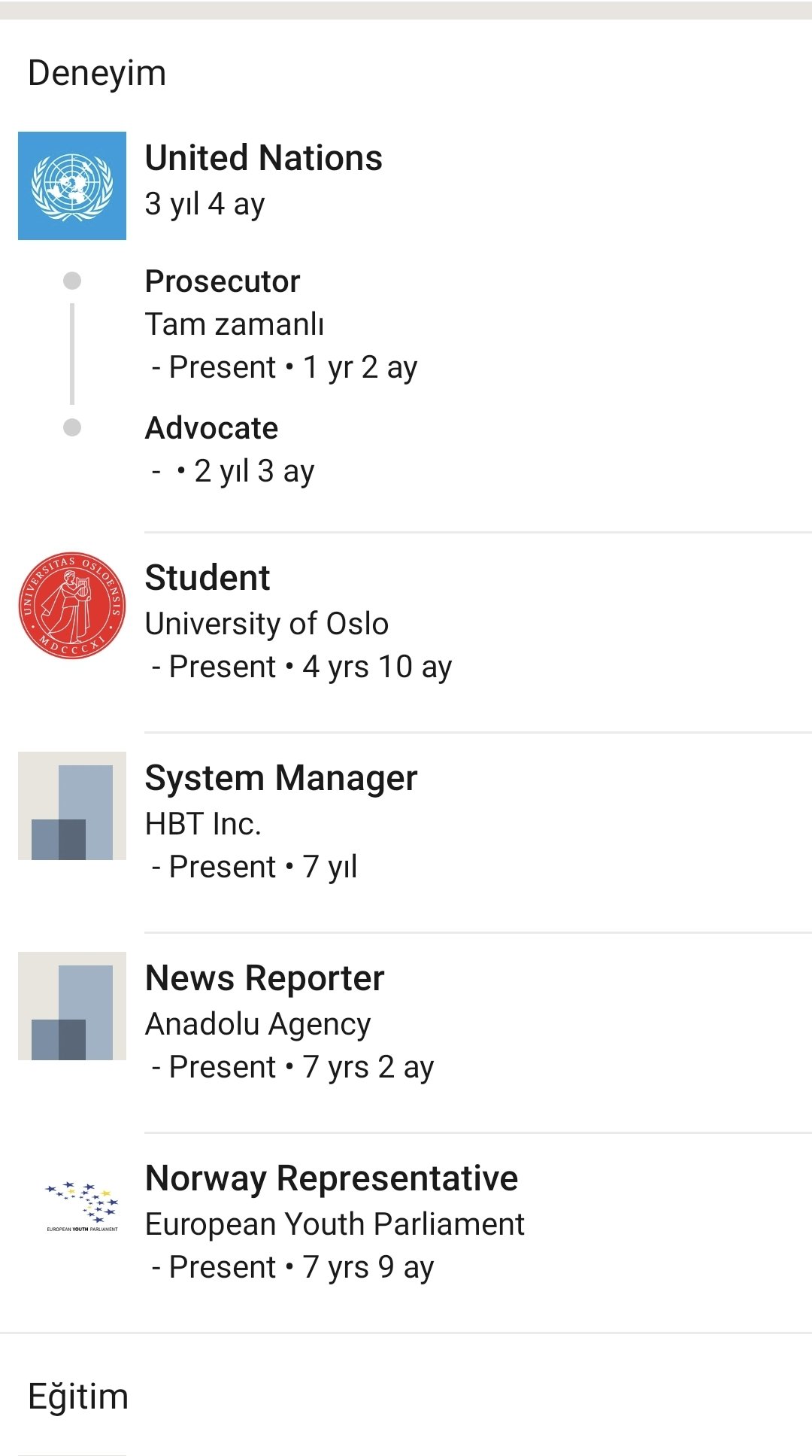 Avukatlık ruhsatını almak için Birleşmiş Milletler Norveç Ofisi’ne staj başvurusunda bulunmuş. Başvurusu onaylanmış.