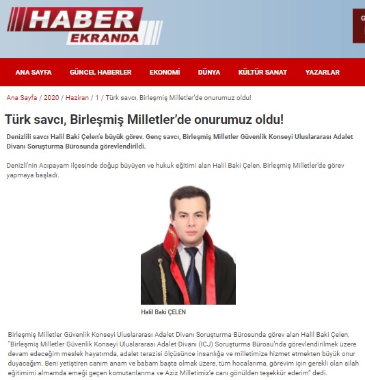 Aynahaber.net, Denizli24haber.com, Haberekranda.com gibi haber sitelerinde “Türk savcı, Birleşmiş Milletler’de onurumuz oldu!” ve “Denizlili Savcıya Büyük Görev” gibi başlıklarla aktarılan (Halil Baki Çelen’in tutuklandığının basına yansımasının ardından silinen) haber metni şu şekildeydi: