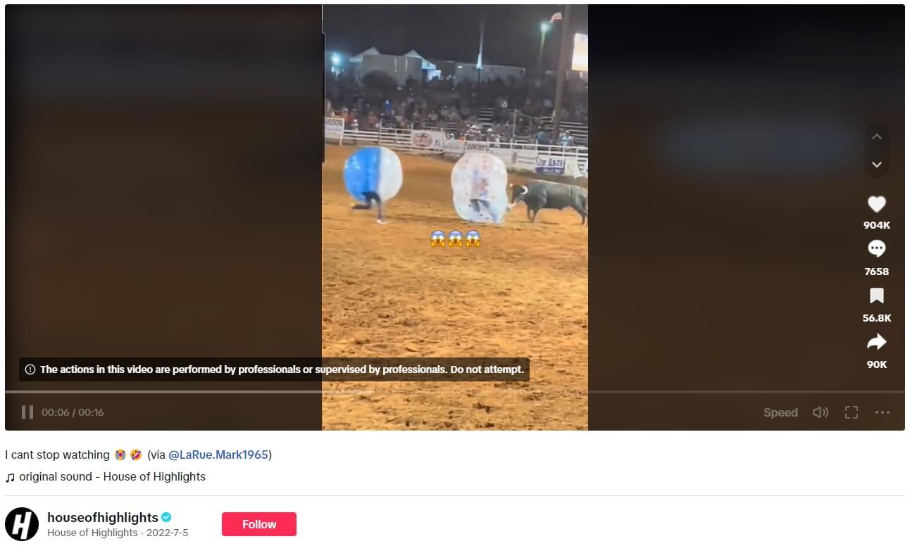 Büyükçe şişme topları giyen kişilerin arenada bir boğadan kaçıştığı görüntü “baloncuklu boğa yarışı” (“bubble soccer rodeo” / “knockerball soccer rodeo”) adı verilen korkunç yaralanmalara yol açabilecek absürt oyuna ait.