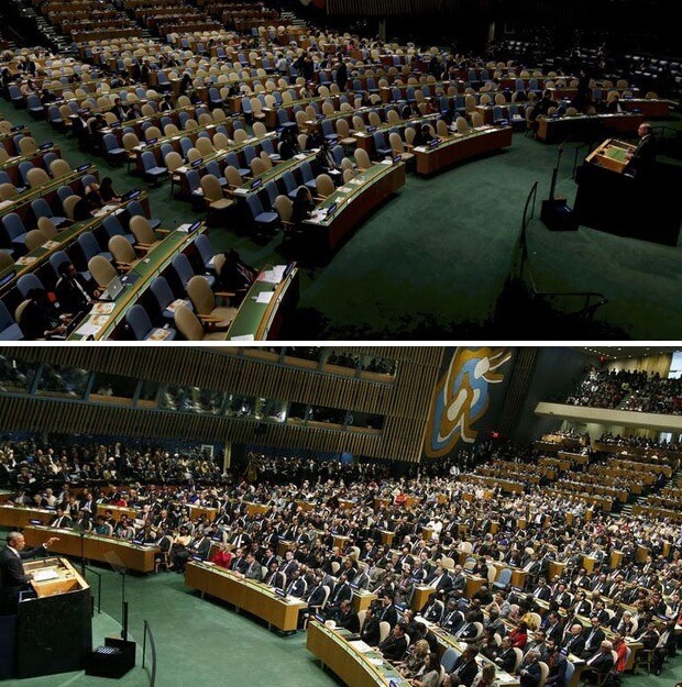 NOT: Birleşmiş Milletler Genel Kurul konuşmalarında salonun doluluğu ülkeden ve kişiden bağımsız olarak, genel bir popülerlik ölçüsü değildir. Delegelerin protesto ya da destek amaçlı katılımında değişiklik yaşanabildiği biliniyor. BM Genel Kurul konuşmalarını ülkelerin üst düzey liderleri değil, görevli diplomat ve delegeleri takip eder.